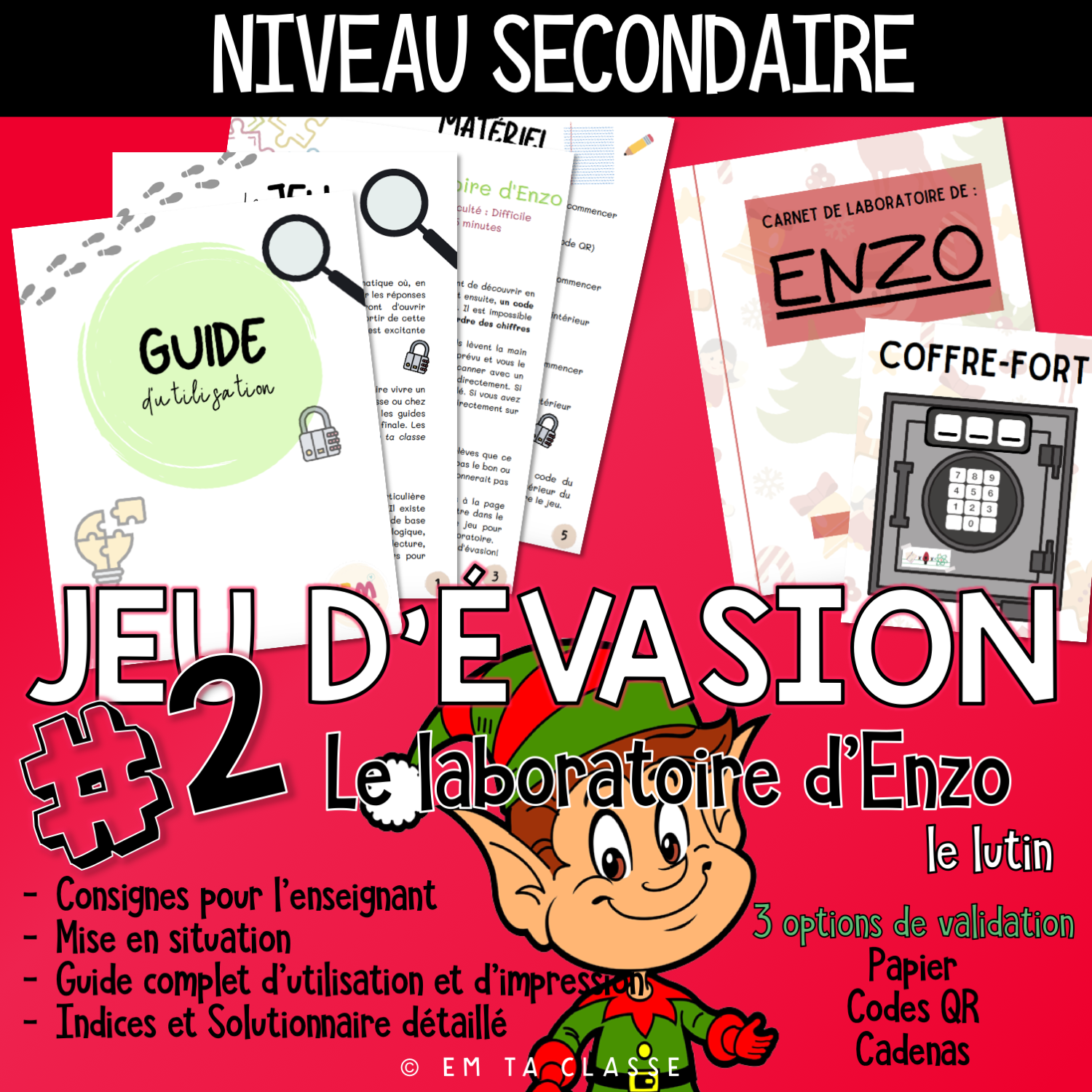 Des jeux testés, pensés et repensés dans le but de faire vivre un jeu d'évasion clé en main dans le confort de votre classe ou chez soi. Ce n'est pas une chasse aux trésors ni une révision de notions «d'école». C'est une activité avec des énigmes inventées de toutes pièces. Tout est à la disposition des joueurs pour réussir. Il existe cependant des niveaux de difficulté. Les connaissances de base et le travail d'équipe sont mis à l'épreuve : déduction, logique, écoute, communication, opérations mathématiques, lecture, manipulation, etc. Les énigmes, le concept et les idées appartiennent à Em ta classe (voir conditions d'utilisation). **Un achat = un document pour une seule personne.** Merci de les respecter!