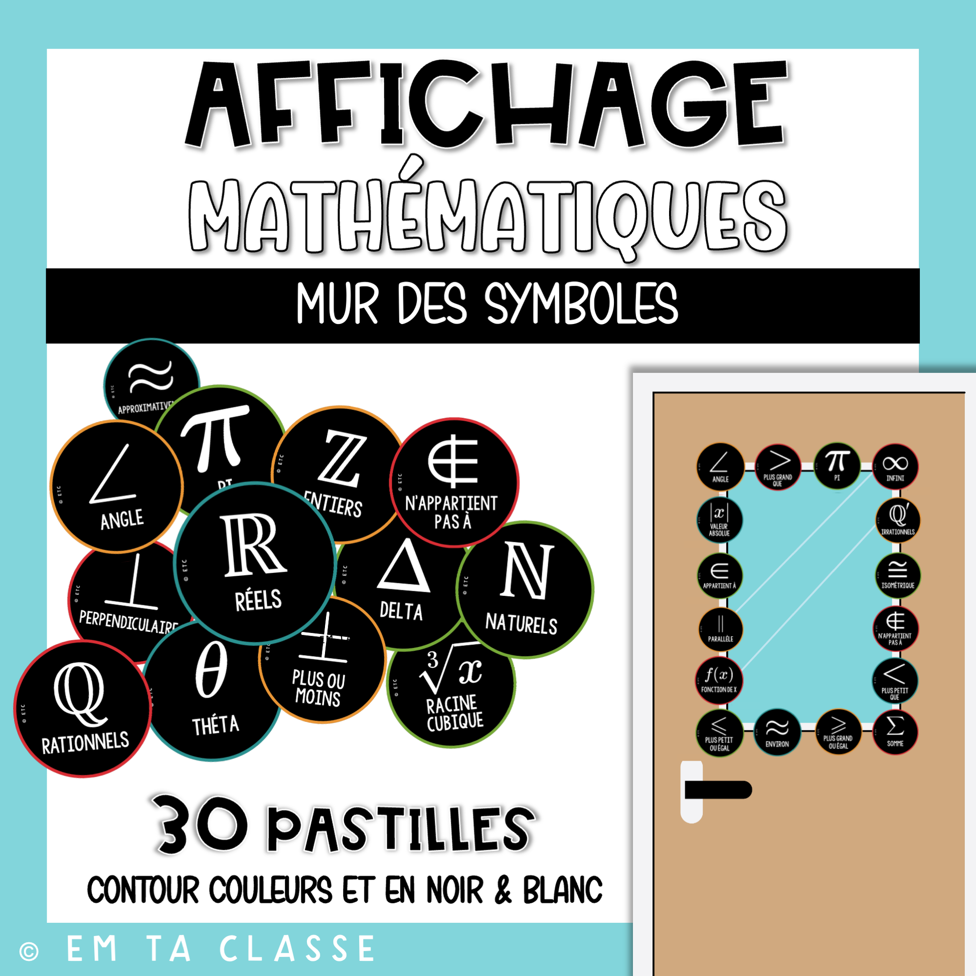 Voici un affichage des symboles mathématiques utilisés au secondaire pour un total de 30 pastilles.