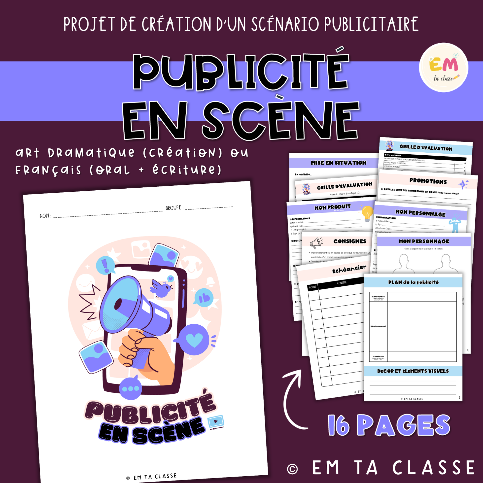 Voici un projet clé en main pour la création d’une publicité individuellement ou en équipe de deux. Il peut être utilisé en art dramatique (compétence créer) ou en français (compétences oral et écriture (ex. : pour travailler les procédés argumentatifs). Il s'adresse à tous les niveaux du secondaire. D’une durée de votre choix, la publicité peut être un sketch devant la classe ou une vidéo. Le scénario peut prendre différentes formes : annonce télévisée, REEL, vidéo TikTok ou Youtube, etc.